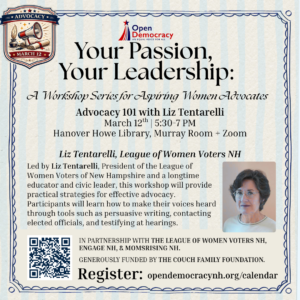 March 5, 2026–April 2, 2026 : Thursday evenings, 5:30 to 7 pm, at Howe Library in Hanover and on zoom. "Your Passion, Your Leadership: A Workshop Experience for Aspiring Women Advocates." Organized by Open Democracy; co-sponsored by League of Women Voters NH. Details of speakers, topics each week, and registration at https://www.opendemocracynh.org/calendarNOTE: time has been updated for these events to 5:30 pm start time. End at 7 pm.